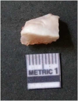 | Description / विवरण | The flake has irregular fracture pattern and sharp flaked edges as a result of lithic knapping activity. The piece is pale, with surfacial flake scars and a bulbous end. The quartz flake is rosy white in colour. |