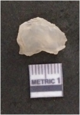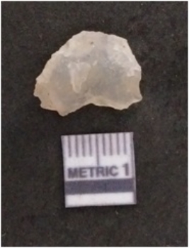 | Description / विवरण | The chalcedony flake is pale in color and translucent in appearance. The piece has s harp flaked ends and a bulbous end due to flaking. The flake has a crypto-crystalline silica matrix. |