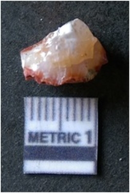 | Description / विवरण | It is chalcedony flake, translucent in appearance. The piece shows sharp pointed ends and flake scars on the surface as a result of flaking. The piece shows a bulb of percussion. |