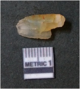 | Description / विवरण | It is chalcedony flake, translucent in appearance. The piece shows sharp pointed ends and flake scars on the surface as a result of flaking. The piece shows a bulb of percussion. |