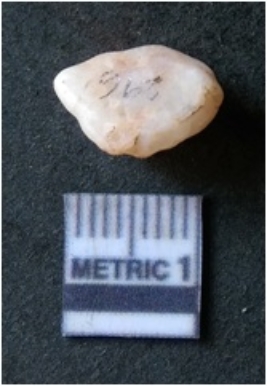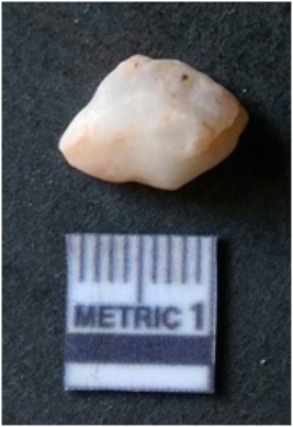 | Description / विवरण | It is chalcedony flake, translucent in appearance. The piece shows sharp pointed ends and flake scars on the surface as a result of flaking. The piece shows a bulb of percussion. |