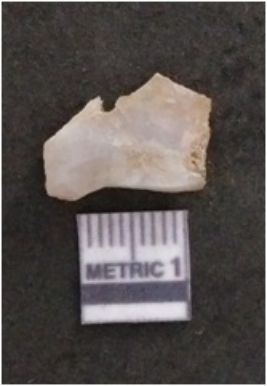 | Description / विवरण | The chalcedony flake is pale in color and translucent in appearance. The piece has s harp flaked ends and a bulbous end due to flaking. The flake has a crypto-crystalline silica matrix. |