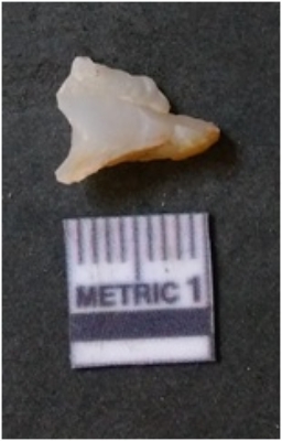 | Description / विवरण | The quartz flake has sharp flaked edges and pointed ends as a result of flaking. The piece is semi-transparent in nature with irregular fracture pattern. The piece is roughly triangular in shape and has a prominent bulb of percussion. |