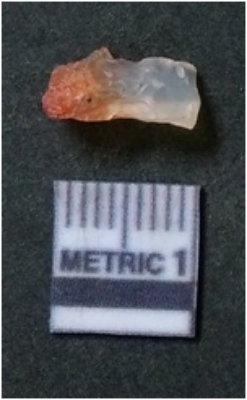 | Description / विवरण | The chalcedony flake has medium flaked ridges and numerous scars on the surface due to flaking. The piece is semi transparent with little red coloration. |