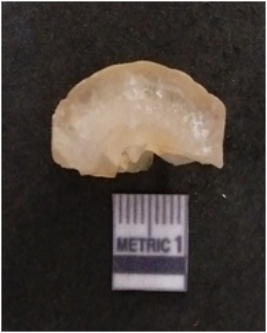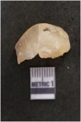 | Description / विवरण | The chalcedony flake is pale in color and translucent in appearance. The piece has s harp flaked ends and a bulbous end due to flaking. The flake has a crypto-crystalline silica matrix. |