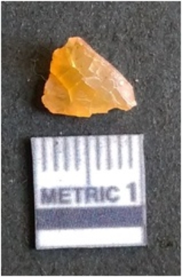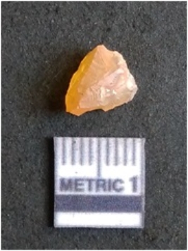 | Description / विवरण | The chalcedony flake is pale in color and translucent in appearance. The piece has s harp flaked ends and a bulbous end due to flaking. The flake has a crypto-crystalline silica matrix. |