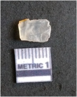 | Description / विवरण | The chalcedony flake is pale in color and translucent in appearance. The piece has s harp flaked ends and a bulbous end due to flaking. The flake has a crypto-crystalline silica matrix. |