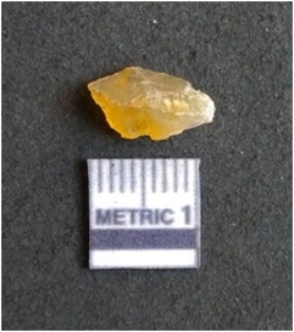 | Description / विवरण | The chalcedony flake is pale in color and translucent in appearance. The piece has s harp flaked ends and a bulbous end due to flaking. The flake has a crypto-crystalline silica matrix. |
