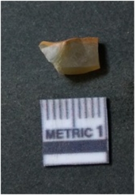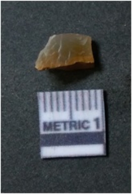 | Description / विवरण | The chert piece is dark in color, with a prominent bulb of percussion and sharp flaked edges. The piece is a part of lithic debitage or raw material for lithic knapping. The piece shows clear ripple marks and bulb of percussion. |