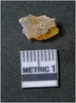 | Description / विवरण | It is chalcedony flake, translucent in appearance. The piece shows sharp pointed ends and flake scars on the surface as a result of flaking. The piece shows a bulb of percussion. |