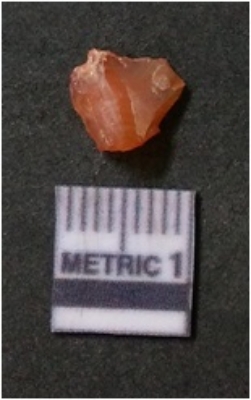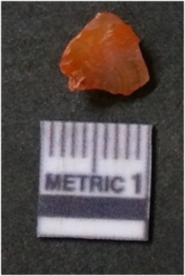 | Description / विवरण | It is carnelian flake red in color, with sharp flakes edges and a small bulb of percussion owing to knapping activity. The piece has sharp flaked edges and a crypto-crystalline matrix. |