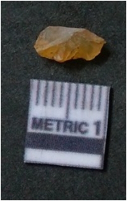 | Description / विवरण | It is chalcedony flake, translucent in appearance. The piece shows sharp pointed ends and flake scars on the surface as a result of flaking. The piece shows a bulb of percussion. |