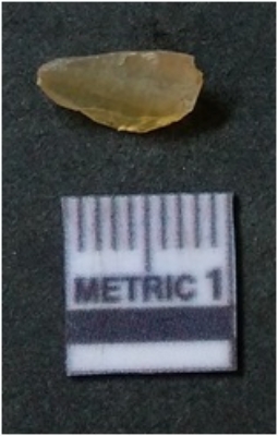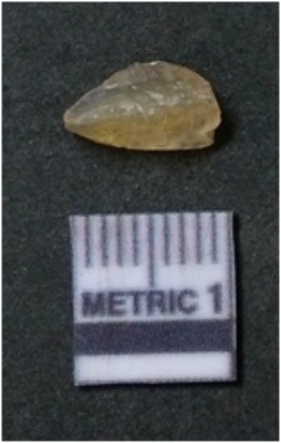 | Description / विवरण | It is chalcedony flake, translucent in appearance. The piece shows sharp pointed ends and flake scars on the surface as a result of flaking. The piece shows a bulb of percussion. |