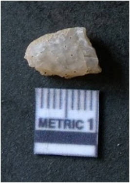 | Description / विवरण | It is chalcedony flake, translucent in appearance. The piece shows sharp pointed ends and flake scars on the surface as a result of flaking. The piece shows a bulb of percussion. |