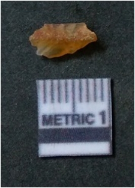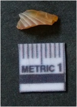 | Description / विवरण | It is chalcedony flake, translucent in appearance. The piece shows sharp pointed ends and flake scars on the surface as a result of flaking. The piece shows a bulb of percussion. |