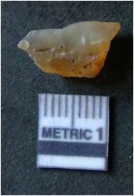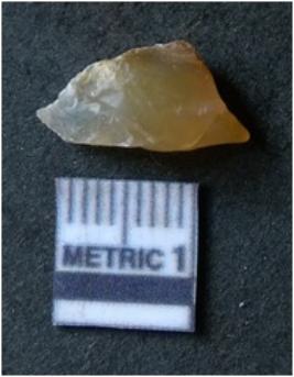 | Description / विवरण | It is chalcedony flake, translucent in appearance. The piece shows sharp pointed ends and flake scars on the surface as a result of flaking. The piece shows a bulb of percussion. |