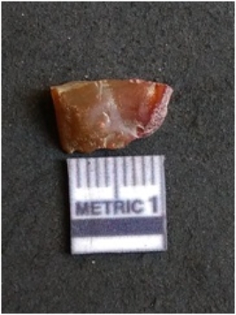 | Description / विवरण | The chalcedony flake is pale in color and translucent in appearance. The piece has s harp flaked ends and a bulbous end due to flaking. The flake has a crypto-crystalline silica matrix. |