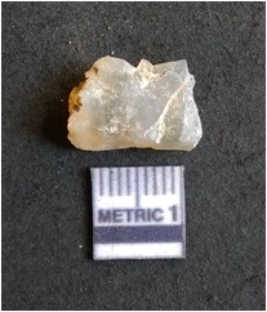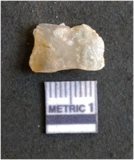 | Description / विवरण | The chalcedony flake is pale in color and translucent in appearance. The piece has s harp flaked ends and a bulbous end due to flaking. The flake has a crypto-crystalline silica matrix. |
