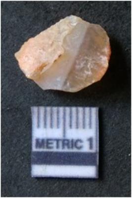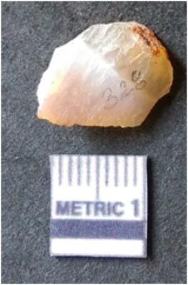 | Description / विवरण | It is chalcedony flake, translucent in appearance. The piece shows sharp pointed ends and flake scars on the surface as a result of flaking. The piece shows a bulb of percussion. |