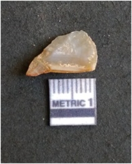 | Description / विवरण | The chalcedony flake is pale in color and translucent in appearance. The piece has s harp flaked ends and a bulbous end due to flaking. The flake has a crypto-crystalline silica matrix. |