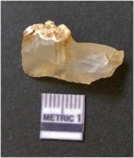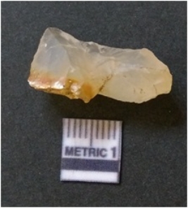 | Description / विवरण | It is chalcedony flake, translucent in appearance. The piece shows sharp pointed ends and flake scars on the surface as a result of flaking. The piece shows a bulb of percussion. |