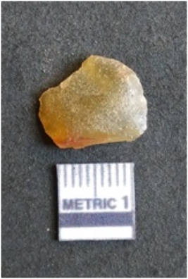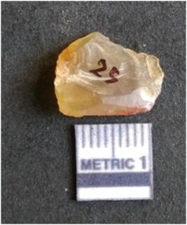 | Description / विवरण | The chalcedony flake is pale in color and translucent in appearance. The piece has s harp flaked ends and a bulbous end due to flaking. The flake has a crypto-crystalline silica matrix. |