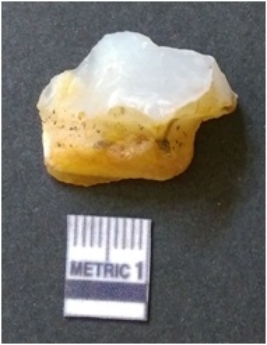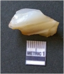 | Description / विवरण | The banded agate piece is crystalline in nature, with a smooth fracture pattern and visible bands on the flaked sides. The piece is pale in color and has sharp flaked ends. |