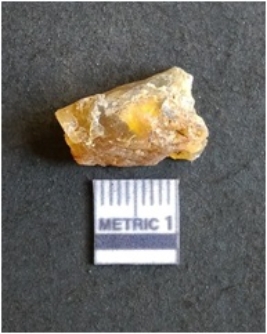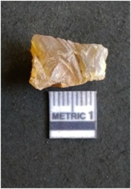 | Description / विवरण | The chalcedony flake is pale in color and translucent in appearance. The piece has s harp flaked ends and a bulbous end due to flaking. The flake has a crypto-crystalline silica matrix. |