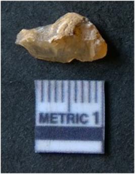 | Description / विवरण | It is chalcedony flake, translucent in appearance. The piece shows sharp pointed ends and flake scars on the surface as a result of flaking. The piece shows a bulb of percussion. |