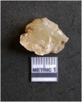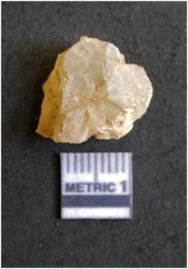 | Description / विवरण | The chalcedony flake is pale in color and translucent in appearance. The piece has s harp flaked ends and a bulbous end due to flaking. The flake has a crypto-crystalline silica matrix. |