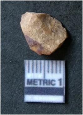 | Description / विवरण | The chert piece is dark in color, with a prominent bulb of percussion and sharp flaked edges. The piece is a part of lithic debitage or raw material for lithic knapping. The piece shows clear ripple marks and bulb of percussion. |