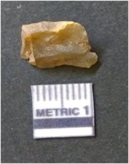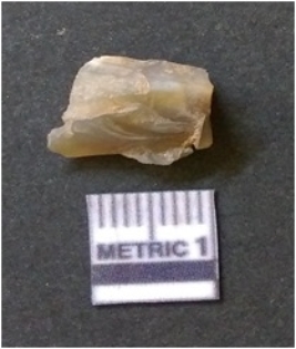 | Description / विवरण | It is chalcedony flake, translucent in appearance. The piece shows sharp pointed ends and flake scars on the surface as a result of flaking. The piece shows a bulb of percussion. |