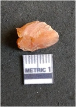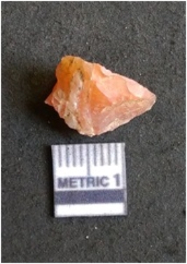 | Description / विवरण | The flake has irregular fracture pattern and sharp flaked edges as a result of lithic knapping activity. The piece is pale, with surface flake scars and a bulbous end. The quartz flake is rosy white in color. |