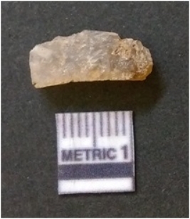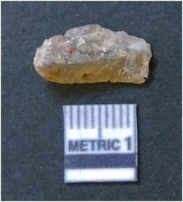 | Description / विवरण | The chalcedony is pale yellowish in color. With flake scars on the surface and sharp ends. The piece is elongated in shape and has a sharp flaked ridges. |