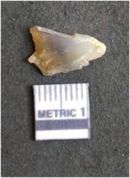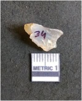 | Description / विवरण | The flake is of smoky quartz variety, grayish in color and translucent in appearance. The flake has irregular fracture pattern and sharp flaked edges as a result of lithic knapping activity. The piece is pale, with surface flake scars and a bulbous end. |