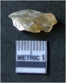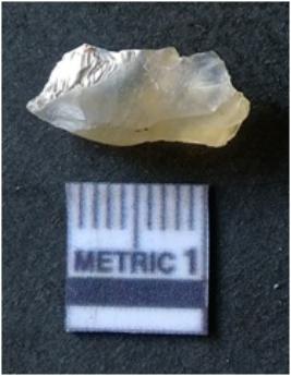 | Description / विवरण | It is chalcedony flake, translucent in appearance. The piece shows sharp pointed ends and flake scars on the surface as a result of flaking. The piece shows a bulb of percussion. |