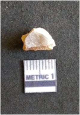| Description / विवरण | The flake is of smoky quartz variety, grayish in color and translucent in appearance. The flake has irregular fracture pattern and sharp flaked edges as a result of lithic knapping activity. The piece is pale, with surface flake scars and a bulbous end. |