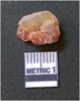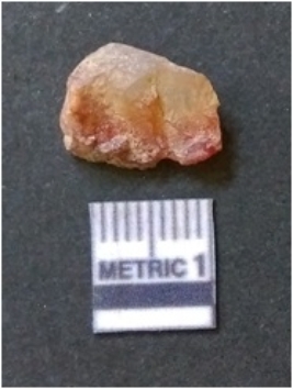 | Description / विवरण | The flake has irregular fracture pattern and sharp flaked edges as a result of lithic knapping activity. The piece is pale, with surfacial flake scars and a bulbous end. The quartz flake is rosy white in colour. |