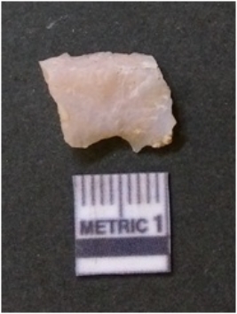 | Description / विवरण | The flake has irregular fracture pattern and sharp flaked edges as a result of lithic knapping activity. The piece is pale, with surfacial flake scars and a bulbous end. The quartz flake is rosy white in colour. |