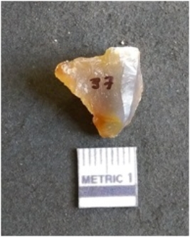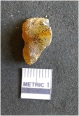 | Description / विवरण | The flake is of smoky quartz variety, grayish in color and translucent in appearance. The flake has irregular fracture pattern and sharp flaked edges as a result of lithic knapping activity. The piece is pale, with surface flake scars and a bulbous end. |