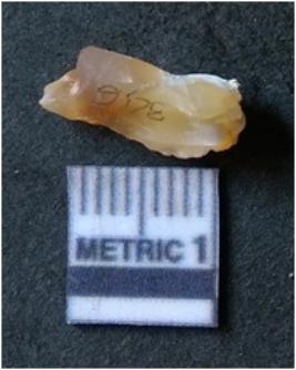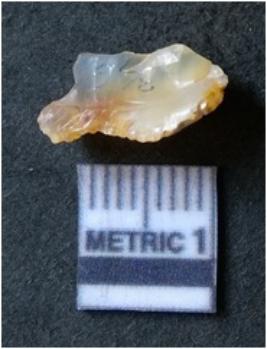 | Description / विवरण | It is chalcedony flake, translucent in appearance. The piece shows sharp pointed ends and flake scars on the surface as a result of flaking. The piece shows a bulb of percussion. |