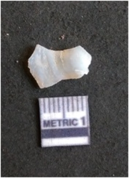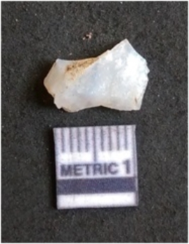 | Description / विवरण | The quartz flake is glassy, and transparent. The flake has irregular fracture pattern and sharp flaked edges as a result of lithic knapping activity. The piece is pale, with surface flake scars and a bulbous end. |