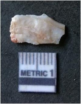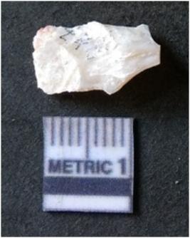 | Description / विवरण | The quartz flake has sharp flaked edges and pointed ends as a result of flaking. The piece is semi-transparent in nature with irregular fracture pattern. The piece is roughly triangular in shape and has a prominent bulb of percussion. |