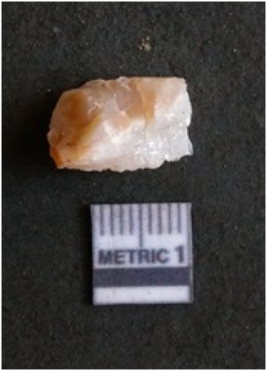| Description / विवरण | The quartz flake is glassy, and transparent. The flake has irregular fracture pattern and sharp flaked edges as a result of lithic knapping activity. The piece is pale, with surface flake scars and a bulbous end. |