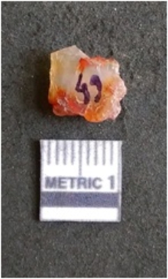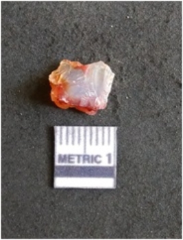 | Description / विवरण | The chalcedony flake is pale in color and translucent in appearance. The piece has s harp flaked ends and a bulbous end due to flaking. The flake has a crypto-crystalline silica matrix. |