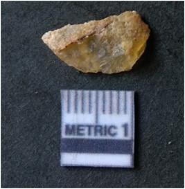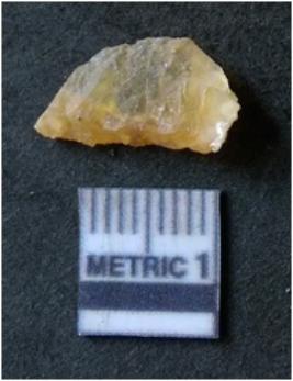 | Description / विवरण | It is chalcedony flake, translucent in appearance. The piece shows sharp pointed ends and flake scars on the surface as a result of flaking. The piece shows a bulb of percussion. |