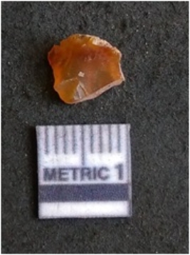 | Description / विवरण | The carnelian flake is red in color, with angular flaked edges and a bulbous end. The piece has sharp pointed end and a crypto-crystalline matrix. The piece is reddish in color; with silica base. |