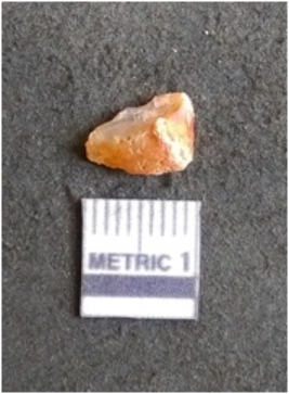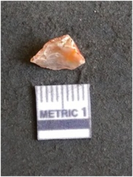 | Description / विवरण | The carnelian flake is red in color, with angular flaked edges and a bulbous end. The piece has sharp pointed end and a crypto-crystalline matrix. The piece is reddish in color; with silica base. |