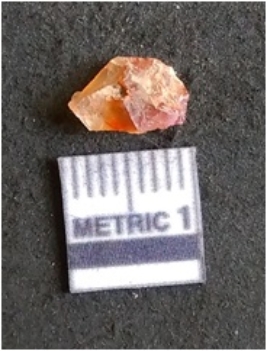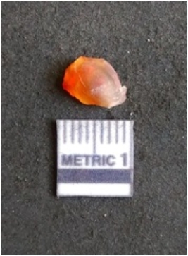 | Description / विवरण | The carnelian flake is red in color, with angular flaked edges and a bulbous end. The piece has sharp pointed end and a crypto-crystalline matrix. The piece is reddish in color; with silica base. |