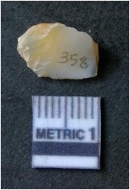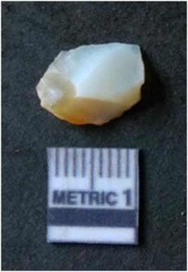 | Description / विवरण | It is chalcedony flake, translucent in appearance. The piece shows sharp pointed ends and flake scars on the surface as a result of flaking. The piece shows a bulb of percussion. |